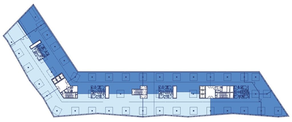 Administrativní budova DOCK IN THREE nabízí téměř 18 000 m2 moderních kancelářských a obchodních ploch, které lze flexibilně upravit podle požadavků nájemců – od otevřených coworkingových zón po uzavřené kancelářské jednotky. Součástí některých prostor jsou také terasy a balkony s výhledem na marinu, které přinášejí příjemné pracovní prostředí a zvyšují reprezentativní hodnotu nemovitosti. Budova splňuje vysoké technické standardy – je vybavena klimatizací, účinným ventilačním systémem, otevíratelnými okny a vnějšími žaluziemi, které zajišťují komfortní mikroklima po celý rok. Zdvojené podlahy a podhledy umožňují efektivní vedení kabeláže a další infrastruktury podle specifikace nájemce.