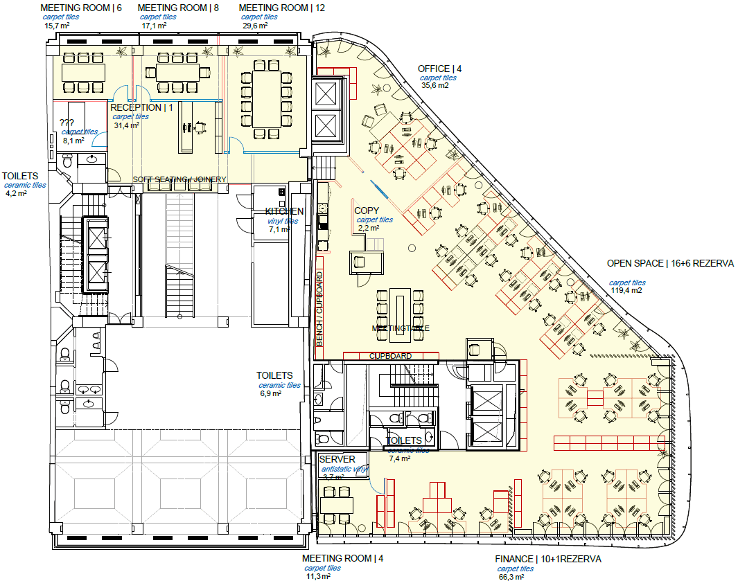 Vybavení prostor odpovídá vysokým nárokům současných firem – nechybí zde zdvojené podlahy, klimatizace, otevíratelná okna, 24/7 přístup na karty, moderní výtahy ani reprezentativní centrální recepce. Nájemci mohou rovněž využívat elegantní vnitřní schodiště, které umožňuje snadný pohyb mezi patry.
