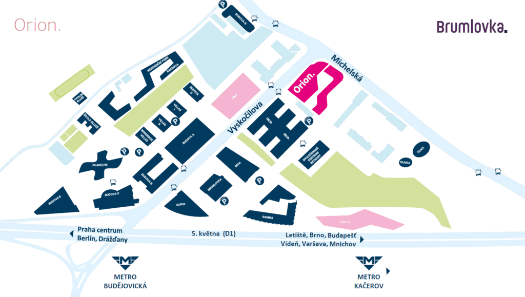Orion je výjimečný multifunkční projekt, který propojuje kanceláře, retail a nájemní bydlení na Brumlovce, na nároží ulic Vyskočilova a Michelská. Objekt s celkovou plochou 28 000 m2 nabídne 19 300 m2 moderních kanceláří v osmi nadzemních podlažích, téměř 2 600 m2 obchodních prostor, 134 plně vybavených bytů s balkony a 491 podzemních parkovacích míst s přípravou pro dobíjení elektromobilů. Důraz na technologickou a ekologickou úroveň stavby podtrhuje využití tepelných čerpadel, geotermálních vrtů, fotovoltaiky a sálavých stropů, doplněných o nadstandardní systém výměny vzduchu s centrální ionizací. Součástí projektu jsou zelené střešní terasy a pobytové náměstí s vodním prvkem, parkovou zelení a relaxačními plochami, které podporují hospodaření se srážkovou vodou. Významným urbanistickým prvkem je nové pěší propojení v podobě tzv. Lombard Stairs, inspirované ikonickou ulicí Lombard Street v San Franciscu. Budova míří na prestižní certifikaci LEED Platinum a energetický standard PENB A. Autorem architektonického návrhu je studio Aulík Fišer architekti.