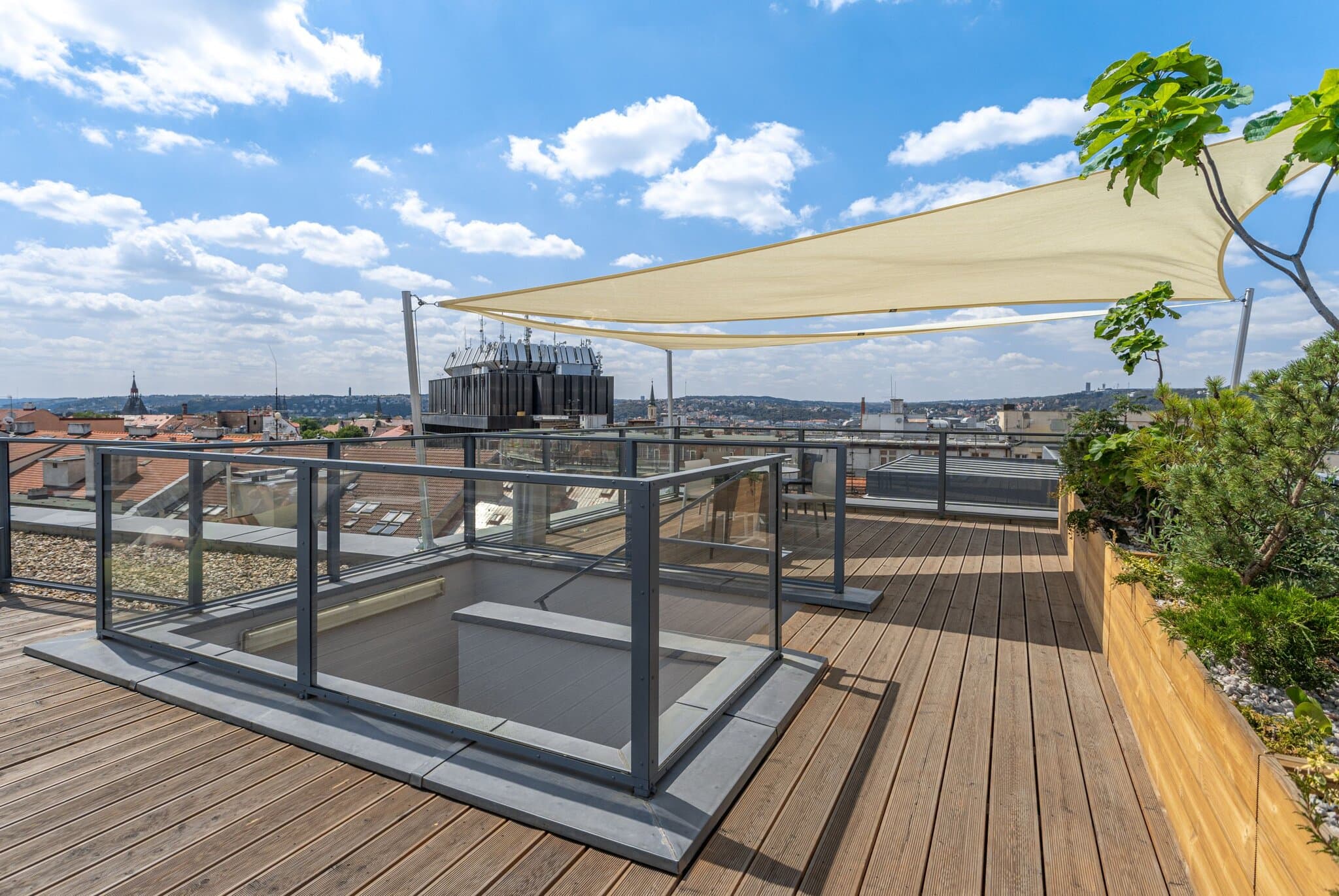 Ke standardu patří také přístup na karty a nepřetržitá ostraha, která zajišťuje bezpečný provoz 24/7. Nájemci mají navíc k dispozici střešní terasu s výhledem na Prahu, reprezentativní recepci, parkování pro jízdní kola i sprchy.